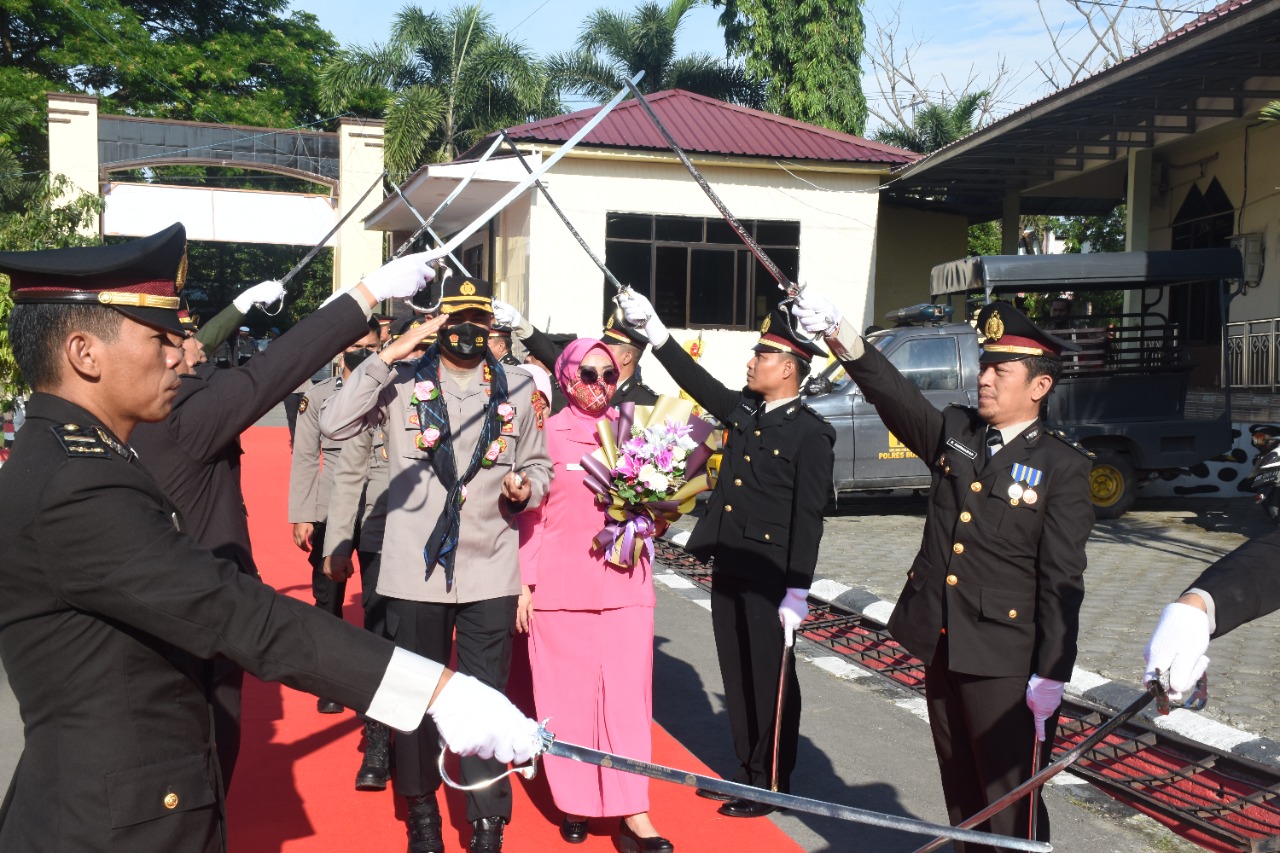Selanjutnya Kapolres Bulukumba bersama Nyonya Ikha Ardyansyah berjalan memasuki Mako Polres Bulukumba di sambut dengan jajar hormat Pedang pora oleh Para perwira Jajaran Polres Bulukumba bersama perwira Jajaran Kodim 1411/Bukukumba.