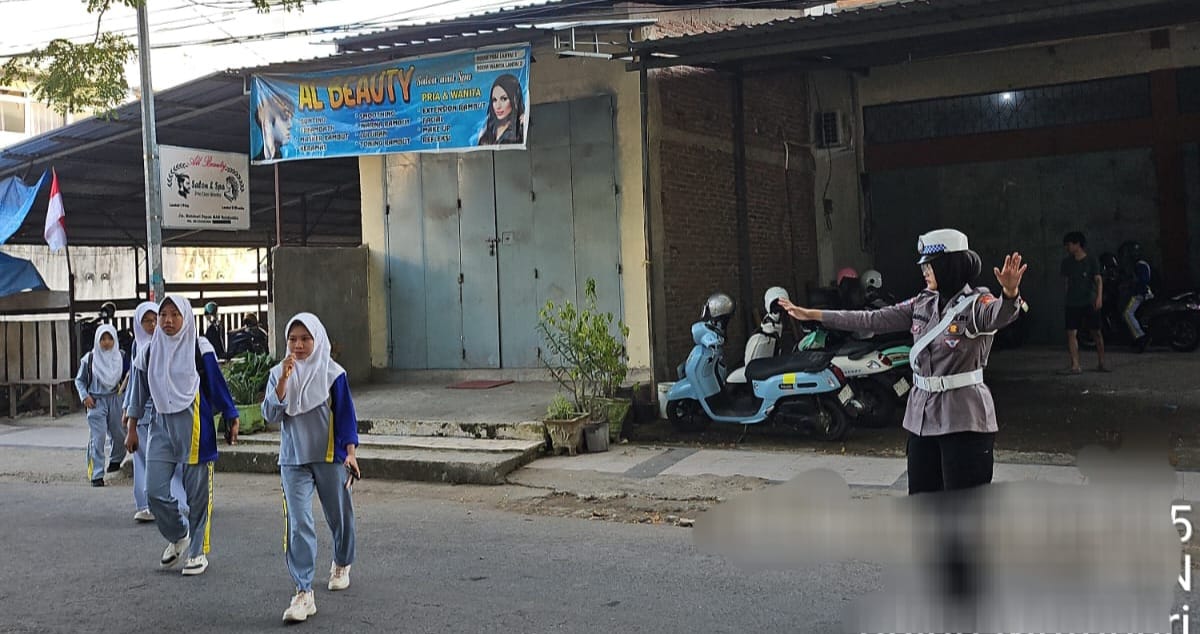 Pada Jumat (15/8/2025) pagi, personel Satlantas aktif melaksanakan pengaturan lalu lintas di sejumlah titik, termasuk membantu para pelajar menyeberang jalan menuju sekolah.
